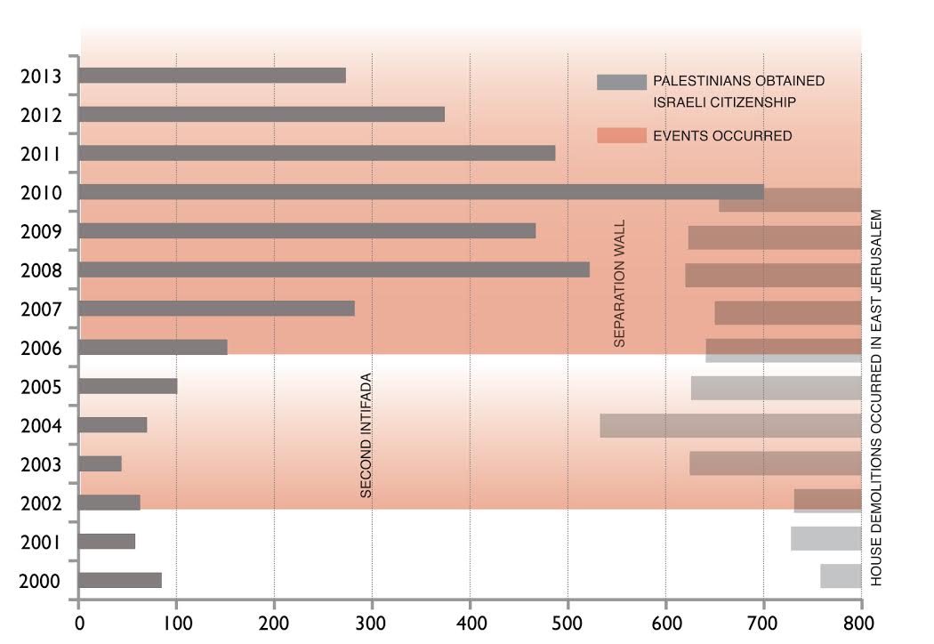 The application for Israeli citizenship by East Jerusalem residents is one of the few options that remain for them. It is still offered by the Israeli government along with a facilitation process. However, the offer of Israeli citizenship for Palestinian Jerusalemites is only one of many policies enacted since 1967. Other policies include the building of Jewish settlements, the confiscation of Palestinian lands, the policy of house demolitions, segregation between the Palestinian communities, physical exclusion by the separation barrier, the constraints of obtaining a building permit, and residency restriction policies. All of these policies are built around the ethno-demographic policy of preserving Jerusalem as “30% Arabs and 70% Jewish.” The change in status of Jerusalemites from residents to Israeli citizens has two dimensions: It can physically exclude the Palestinians from Jerusalem by their own choice, or it can allow them to be considered Israeli inhabitants living in East Jerusalem if they decide to continue living in the city. Understanding the murky details and concepts of planning policies in Jerusalem is never an end in itself; however, these policies could lead to a change in East Jerusalem as Palestinian residents have the ability to become Israeli citizens.