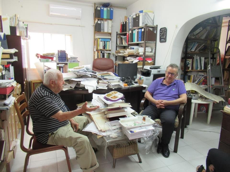 استقبلنا المؤرخ التسعيني ببشاشةٍ على مدخل حديقته وقد انفرجت أسارير وجهه بابتسامة مشرقة و قادنا بنشاط وهمة إلى مكتبه حيث انتشرت الأوراق والكتب هنا وهناك وانهمرت من الرفوف تناثرت على جميع الأسطح ما بين كتب مفتوحة ومقلوبة على الصفحات حرصًا على أن يرجع إلى الصفحة المنشودة بسهولة وسط مخطوطات وأوراق أبحاث ومراجع ورقية في فوضى خلّاقة، أعرفها حق المعرفة فهي متلازمة للعمل الإبداعي وهي المراجع الضرورية التي يعرف الباحث مضمون كل ورقة وكل كتاب فيها، فيرجع إليها في أيّة لحظة أثناء العمل لإسناد أفكاره والاستشهاد بصفحات وفقراتٍ، وقد استعملها أيضًا معنا أثناء الكلام عن جبال ودروب فلسطين، وجوامعها وكنائسها، عن النباتات والأسماء وعن الشرطة في عصر الانتداب وبنية القرية العربية...إ فما نراه فوضى عارمة هو انعكاس لمنظومة فكرية منطقية تلعب فيها الفهرسة والتصنيف وما يرافقهما من عزل وفصل وتبويب تعكس بمجموعها ذلك الإنتاج العلمي الخاص بالدكتور "شكري عراف" حول معالم هوية فلسطين الجغرافية والمعمارية والذي أهداني مشكورًا عددا من مؤلفاته وكتبه، أذكر على سبيل المثال لا الحصر: كتاب "القرية العربية الفلسطينية: مبنى واستعمالات أراضي" و"مصادر الاقتصاد الفلسطيني: من أقدم الفترات إلى عام "1948 " و"المنشية" و"منصورة عين إيل" و"مساهمة في دراسة نباتات البلاد"...الخ.
