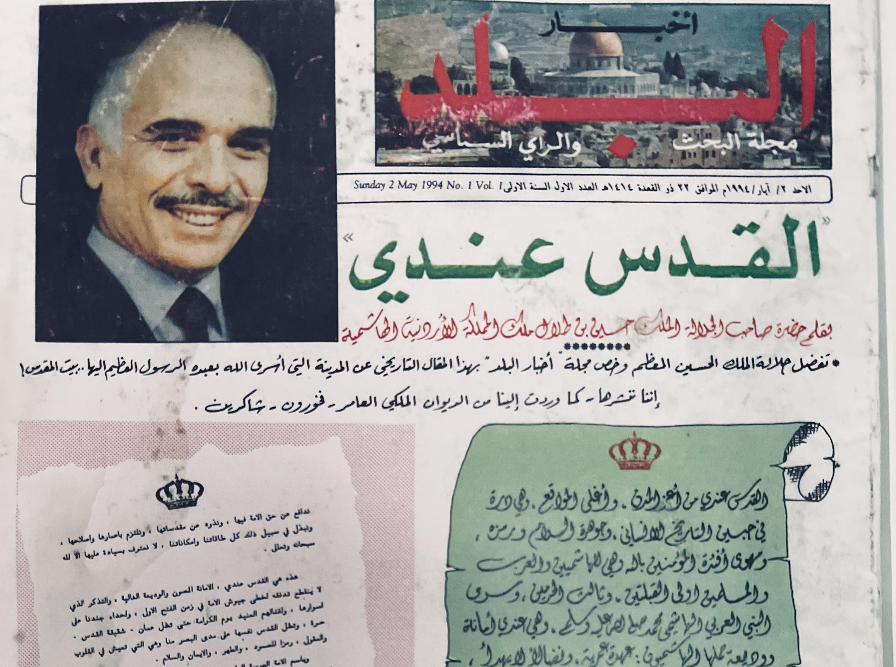 " تفضل جلالة الملك الحسين المعظم وخص مجلة " أخبار البلد" بهذا المقال التاريخي عن المدينة التي اسرى الله بعبده الرسول العظيم اليها .. بيت المقدس! اننا نشره - كما وردت الينا من الديوان الملكي العامر- فخورين- شاكرين: