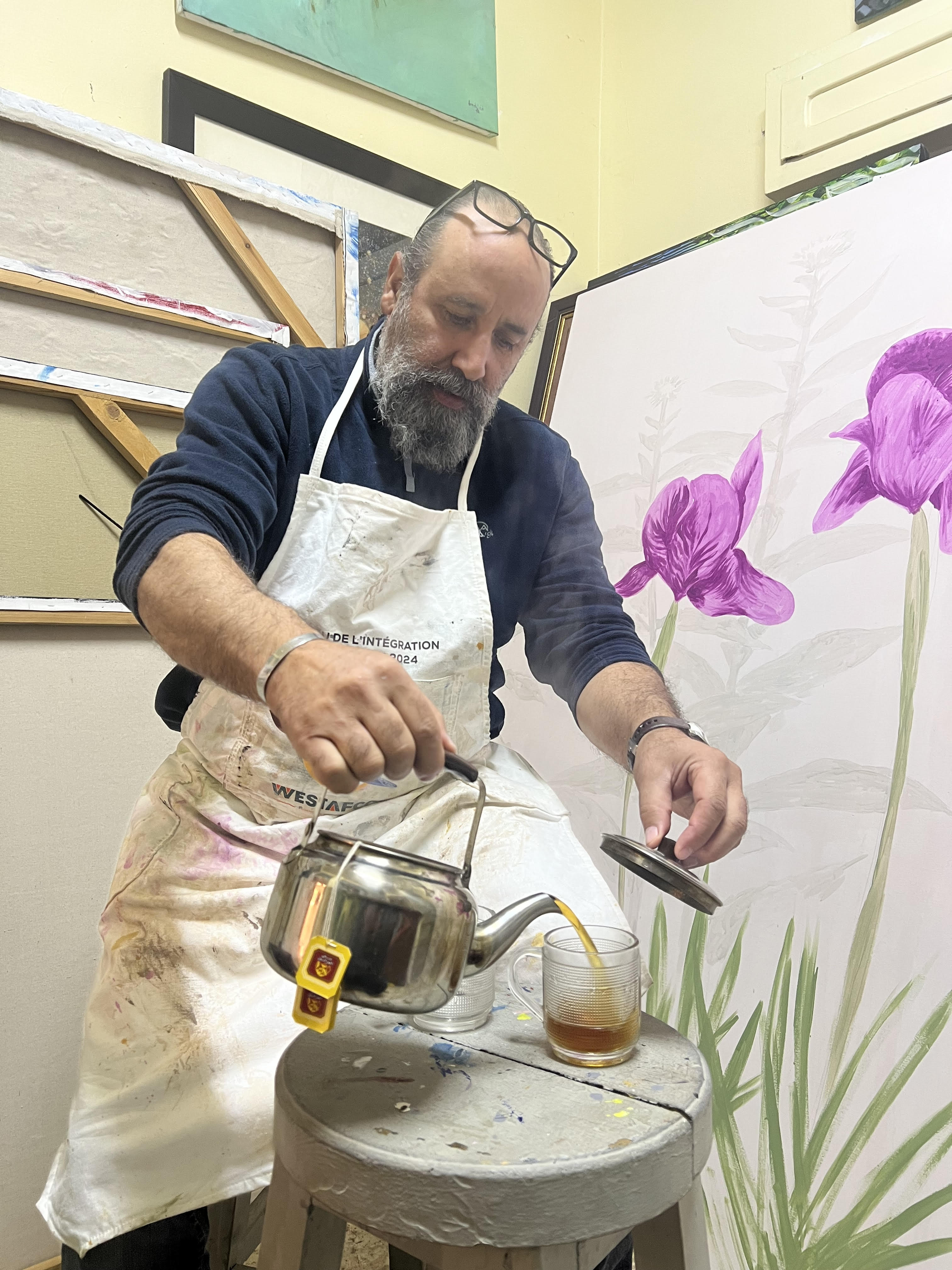 وبعد أن أعد الشاي في ذلك الوعاء التراثي توجه الى مرسمه وهناك بدا حديث متعدد ومتشعب كله فن وعبر.