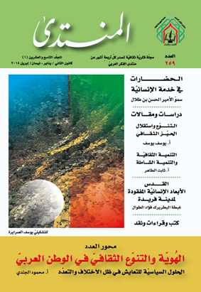 عمّان - صدرعنمنتدىالفكرالعربيالعدد (259) منالمجلةالفكريةالثقافية"المنتدى"،مشتملاًعلىمجموعةمنالدراساتوالمقالاتتمحورمعظمهاحولموضوعالهويةوالتنوعالثقافيفيالوطنالعربي. ويتصدرالعددكلمةسموالأميرالحسنبنطلال،رئيسالمنتدىوراعيه،التيألقاهافيمؤتمر "الحضاراتفيخدمةالإنسانيّة"،الذيعُقدبالمنامةخلالالفترة 5-7 أيار/مايوالماضي، برعايةجلالةملكالبحرينالملكحمدبنعيسىآلخليفة . وقددعا سموّهفيهذهالكلمةإلىاعتمادالثقافةالعربيةوالإسلاميةأساساً لثقافةالحواروالتفاعلمعالثقافاتالأخرى،كونهاثقافةترفضجميعأشكالالتعصبوالانغلاقوالتطرفوالعنفونزاعاتالهيمنةوالانفراديةوالإقصاء،وتؤمنبالاختلافوالتعددوالتنوع،التيهيظواهرمرتبطةبالطبيعةالإنسانيةنفسها.