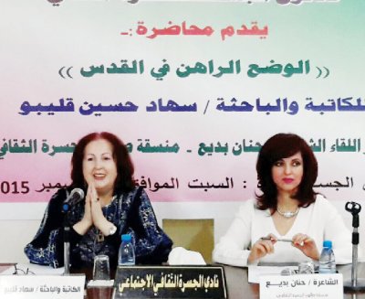 الدوحة - اخبار البلد- القت الباحثة المقدسية سهاد قليبو، احدى الشخصيات المقدسية المعروفة والتي تحمل الهم المقدسي الى العالم وبالتحديد في قطر محاضرة بعنوان «الوضع الراهن في القدس» نظمها نادي الجسرة الثقافي والاجتماعي، وإدارة اللقاء الشاعرة حنان بديع، اكدت فيها أن الفلسطينيين عامة والمقدسيين خاصة، يقدرون العطاء القطري المستمر والمتواصل، الذين يضعون قضية فلسطين والقدس في قلوبهم، ويدعمون بسخاء الصمود المقدسي في مواجهة الصهيونية والكيان المحتل، مشيرة إلى مواقف قطر الثابتة والداعمة لقضية الشعب الفلسطيني، وأن القيادة القطرية دائما تؤكد حرصها على عروبة المدينة المقدسة.