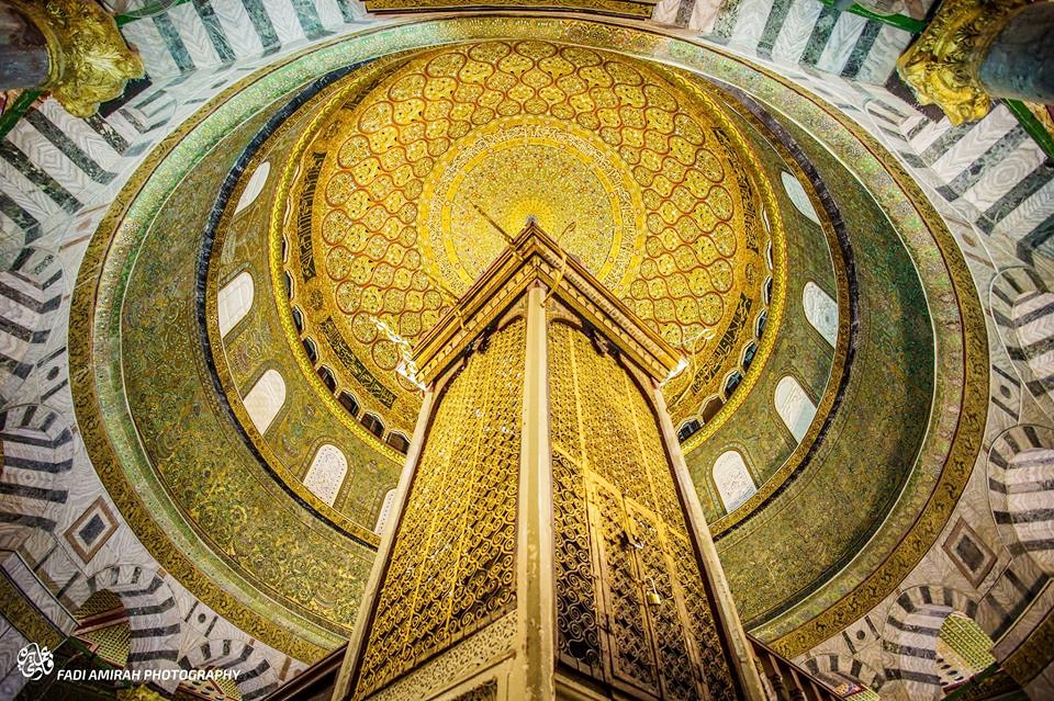 استغرقت مجمل عمليّة ترميم زخارف قبّة الصخرة ثماني سنوات، كانت كافية للانتهاء من ترميم وتذهيب حوالي 900 متر مربّع، وهي مساحة القبّة الذهبيّة من الداخل، وقد أُعيد تأسيس مساحات معيّنة منها تعرّضت لأضرار بالغة نتيجة تسرّب مياه الأمطار. يشمل مبنى قبّة الصخرة المشرّفة، والذي كُسِيَت جدرانه بالرخام، الصخرة ومن أسفلها المغارة، والتي تشير المرويّات الإسلاميّة إلى عروج الرسول محمّد (ص) منها نحو السماوات العُلا، كما يضمّ حاجزًا خشبيًّا مزخرفًا كان صلاح الدين الأيوبيّ قد أحضره معه لدى تحريره القدس، بالإضافة إلى أربعة أبواب وشبّاكين اثنين.