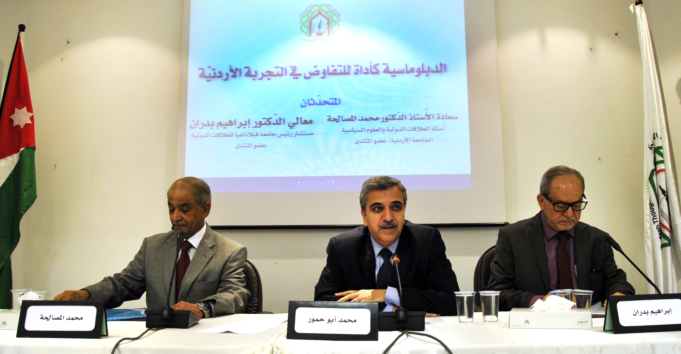 أدار اللقاء وشارك فيه الأمين العام لمنتدى الفكر العربي د. محمد أبو حمور، الذي أكد أن التجربة الأردنية في مفاوضات السلام تمثل مرحلة ذات دلالات مهمة في تاريخ الأردن الحديث، منذ مؤتمر مدريد عام 1991 وحتى إعلان واشنطن (25/7/1994) بانتهاء حالة العداء بين الأردن وإسرائيل، ثم معاهدة السلام المعروفة باسم معاهدة وادي عربة (26/10/1994).