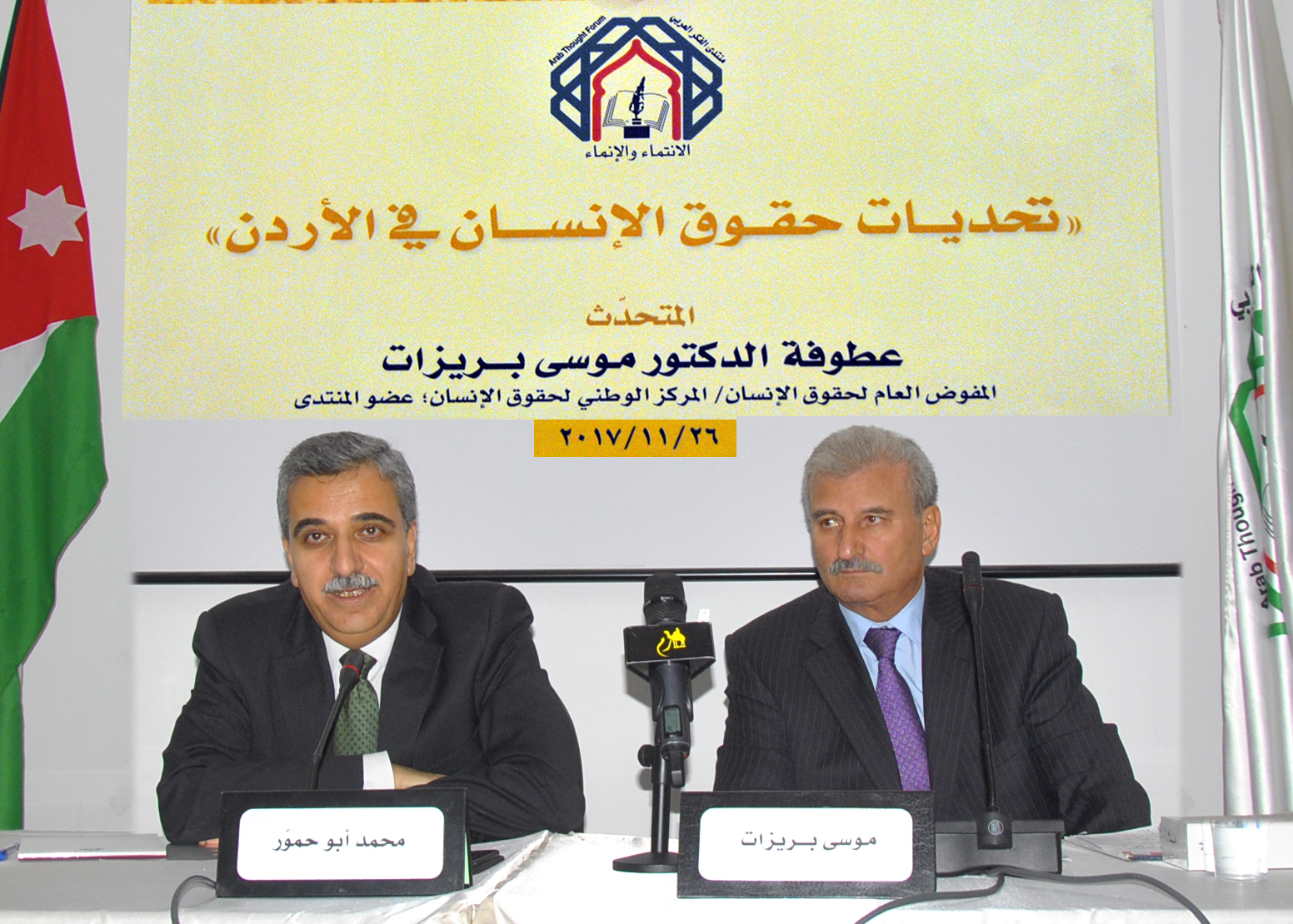 عمان - اخبار البلد- ناقش لقاء منتدى الفكر العربي عدداً من الجوانب المتعلقة بتحديات حقوق الإنسان في الأردن، وقدم د. موسى بريزات المفوض العام لحقوق الإنسان في المركز الوطني لحقوق الإنسان وعضو المنتدى محاضرة تناول فيها واقع حقوق الإنسان في الأردن في ضوء الإطار المرجعي لها من حيث المعايير والقواعد وكذلك آليات المتابعة والرصد.