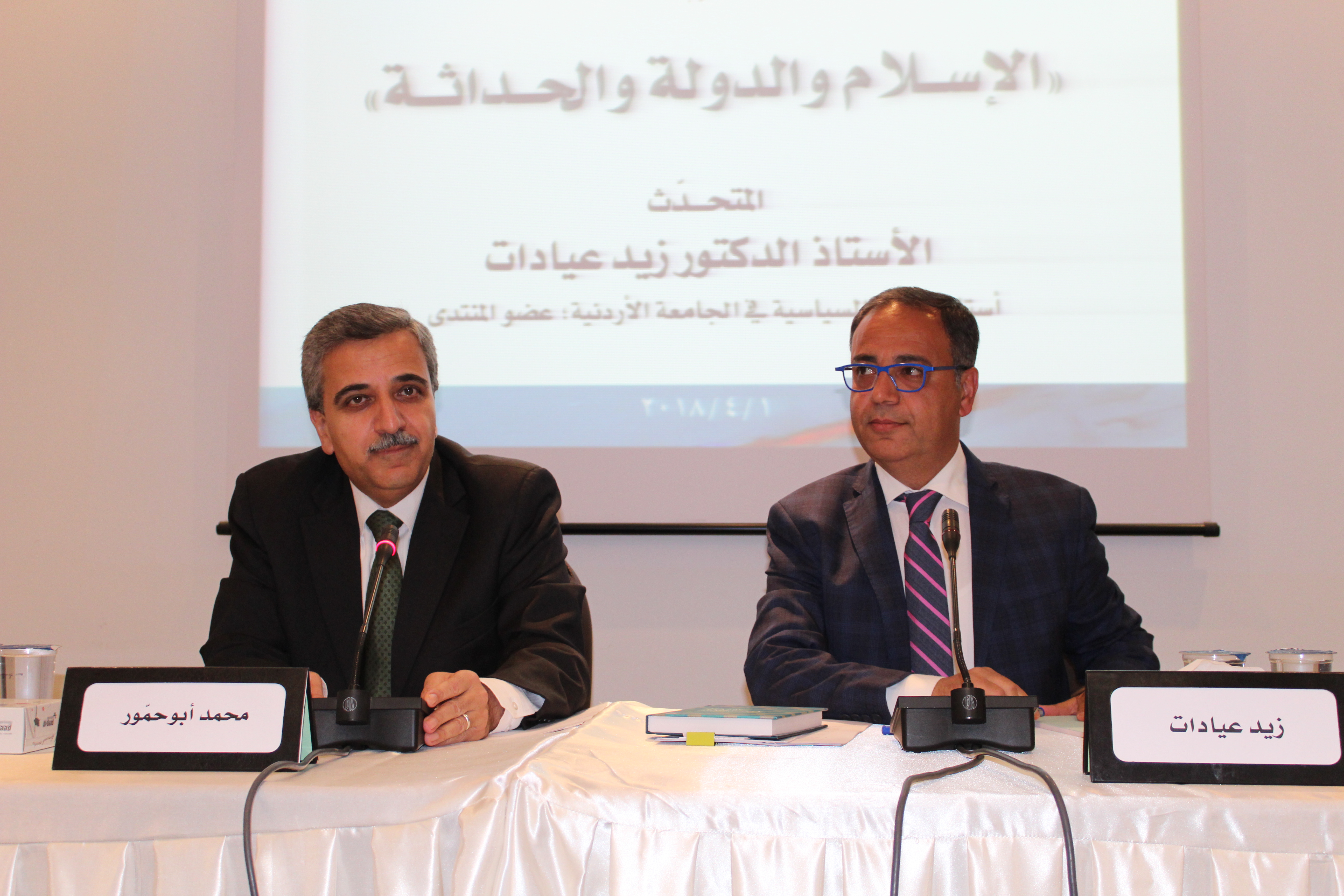 أدار اللقاء وشارك في مناقشة الكتاب الأمين العام للمنتدى د. محمد أبوحمور الذي قال في كلمته التقديمية: إن الجدل الفكري حول الإسلام والدولة، والإسلام والحداثة، بدأ الحديث فيه منذ بدايات النهضة العربية الحديثة في أواخر القرن التاسع عشر، وأن الأرث الحضاري والفكري للأمة ينبغي أن يكون حاضراً بروح استنباط قيم الأصالة والتطوير وليس بصورة تقليدية. وأضاف أن هذه الرؤية جزء من مشروع "النهضة الفكرية العربية" الذي يتبناه المنتدى، والذي يهدف إلى إعادة قراءة المشروع النهضوي العربي عبر آليّات جديدة للمراجعة والاستشراف، وابتكار بُنى فكرية تجديدية واعية للمتغيرات العالمية في موازين القوى والتحالفات والتكتلات على الساحة الدولية، لتحفيز منطلقات النهوض الشامل ومواجهة التراجع المستمر في الواقع العربي ومحاولات إذابة الهوية الجامعة.