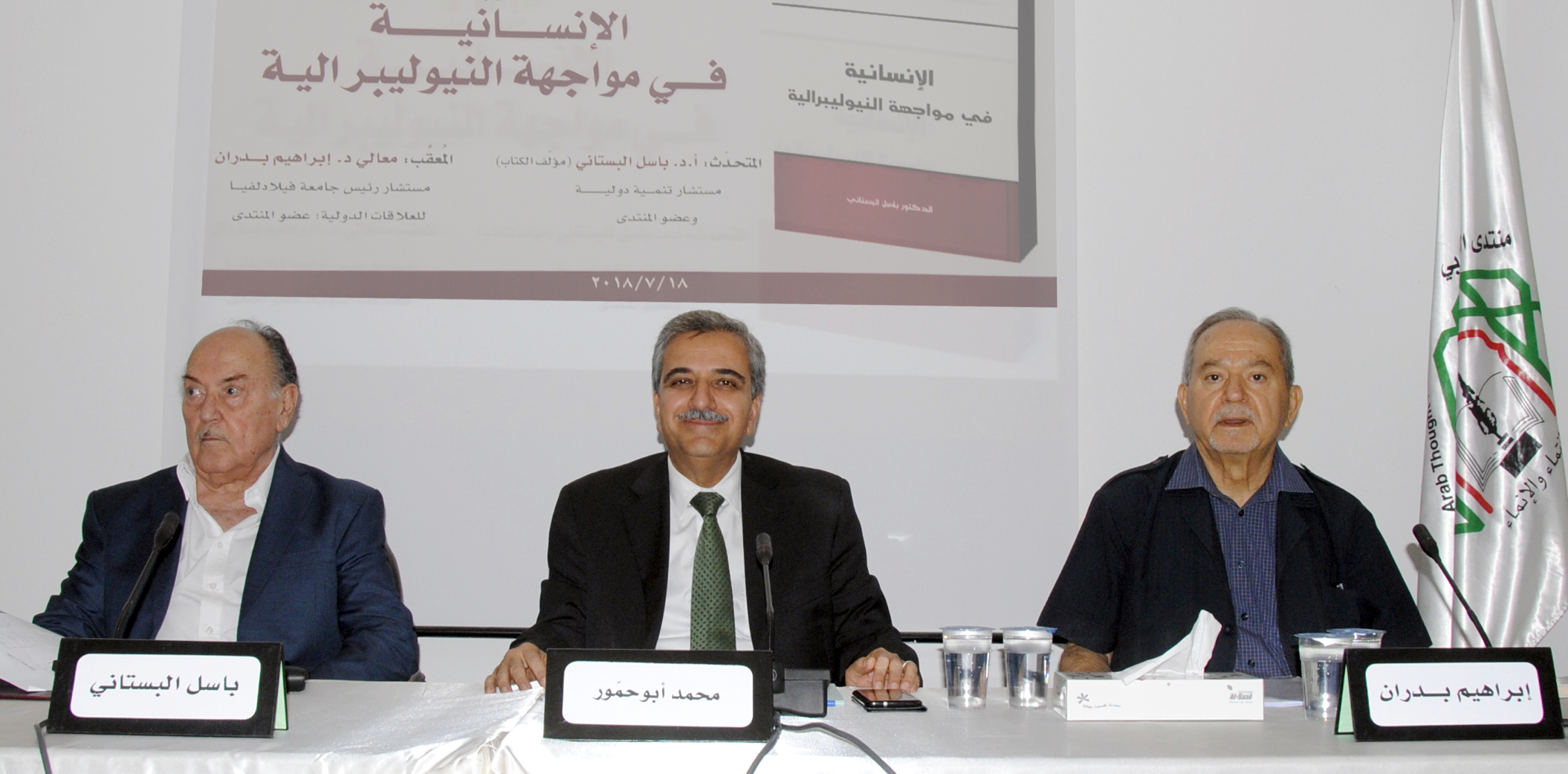 عمان - أخبار البلد - استضاف منتدى الفكر العربي لقاءً جرى خلاله مناقشة وإشهار كتاب "الإنسانية في مواجهة الليبرالية" من تأليف أ.د. باسل البستاني عضو المنتدى والمستشار في التنمية الدولية، والصادر هذا العام عن مركز دراسات الوحدة العربية في بيروت، ويوثق الكتاب ويحاور انطلاقة ومسار التيارين الإنساني والنيوليبرالي بكل مكوناتهما، ليصل في النتيجة إلى أن نظام الرأسمالية النيوليبرالية قد بلغ مداه وأنه يسير نحو نهايته، في مقابل وجود علائم لارتقاء البديل المتمثل بكينونة ثلاثية مدمجة اقتصادية واجتماعية وبيئية ضمن حاضنة الاستدامة، أو بشائر ولادة نهج التنمية الإنسانية الشاملة.