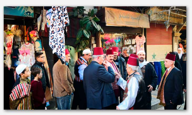 تجمع العشرات من أبناء حي القنوات وسط دمشق القديمة، بزيــــهم التقليدي المكوّن من سراويل وسترات قماشية وأحزمة عريضة على الخصر وطرابيش حمراء على الرؤوس، ليبدأوا بعد جولة صغيرة في المنطقة احتفالاً خاصاً بهم في أحد المنازل العريقة داخل الحي.
