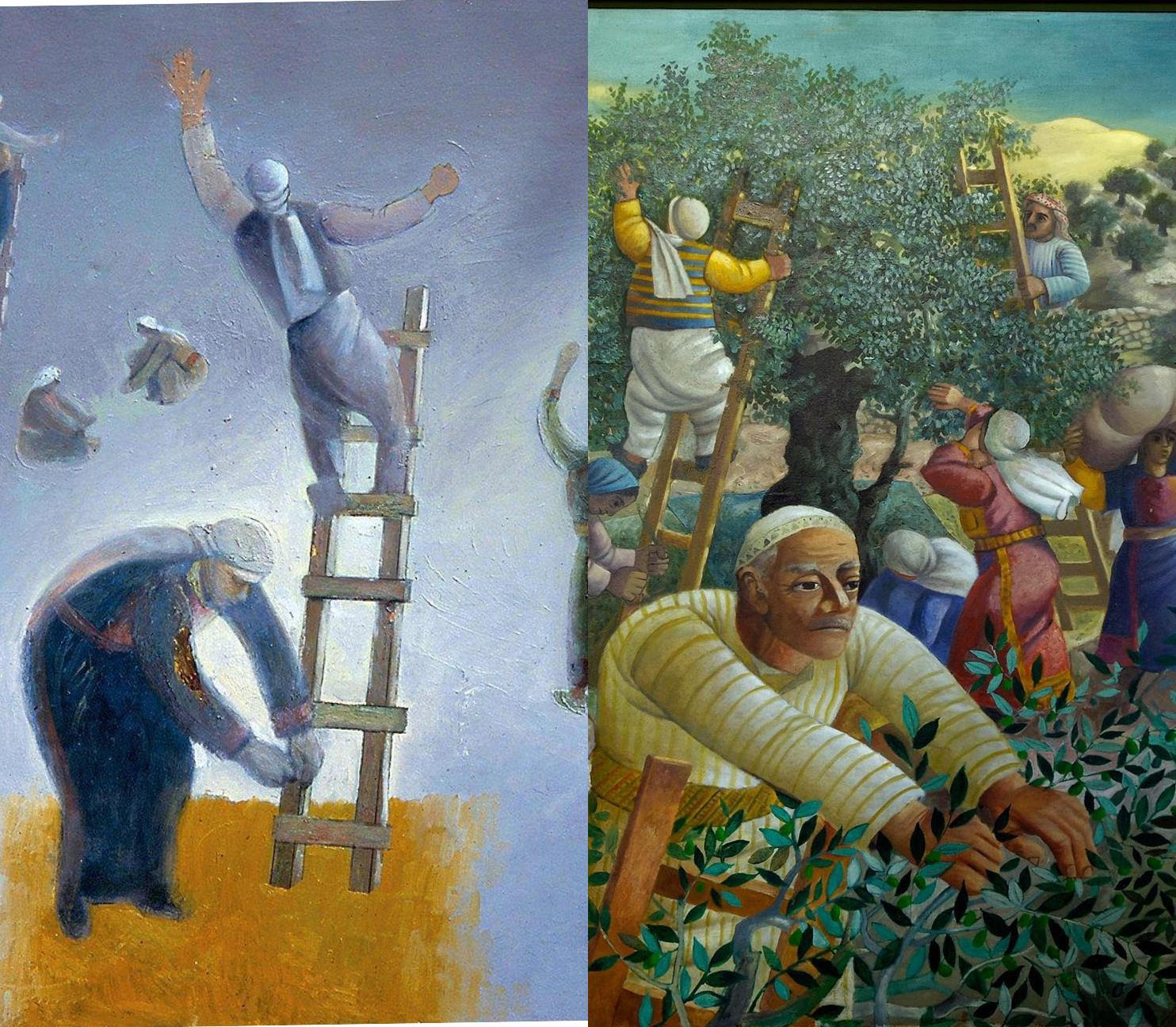 لوحتان: الأولى بالبشر والشجر وحب الزيتون. والثانية بالبشر، فابدأ بأي منهما، لتتعمق في معنى العدل والإنسانية والفن!