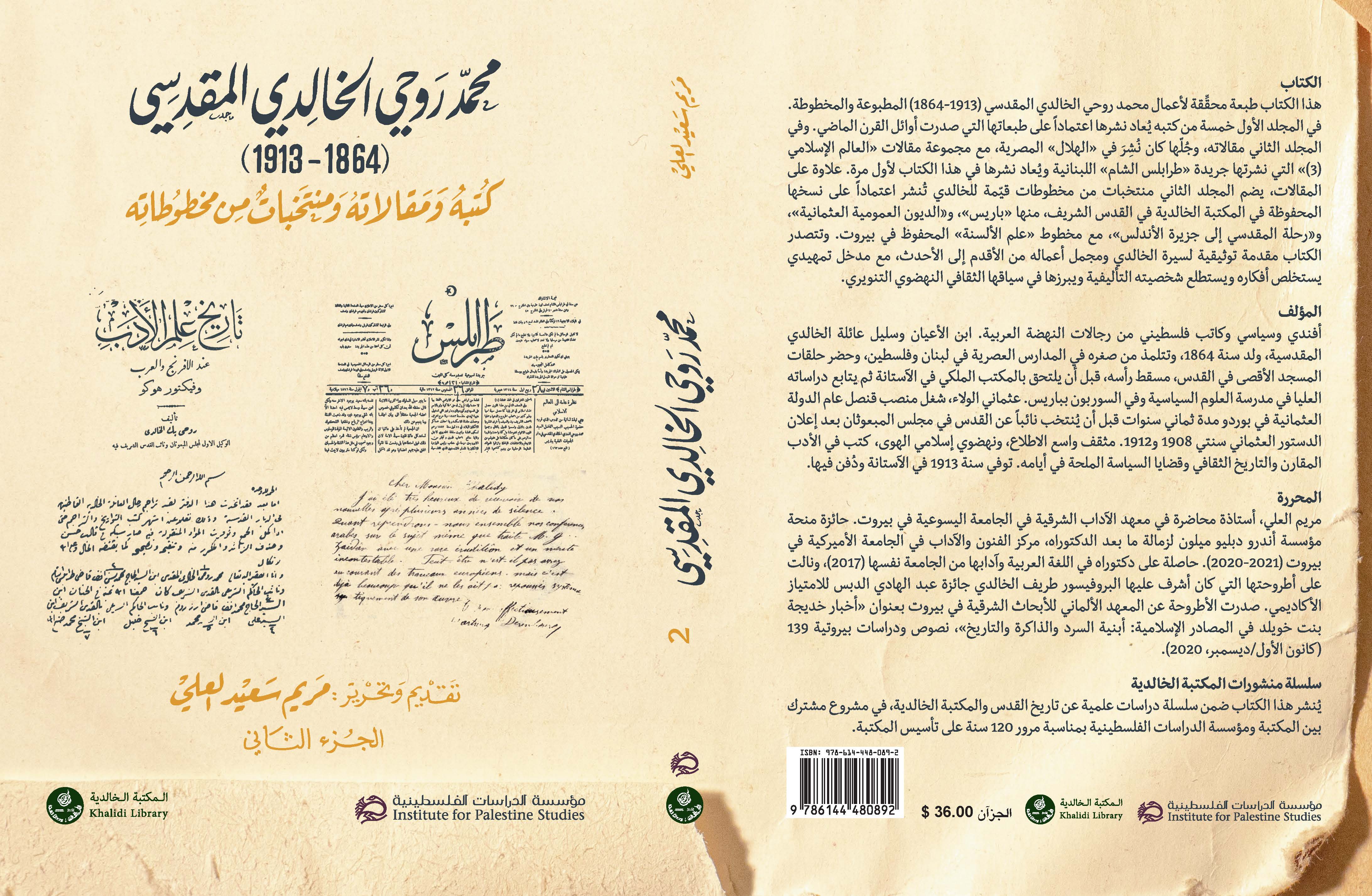 القدس – أخبار البلد – وتستمر مؤسسة الدراسات الفلسطينية بإصدار مزيد من المؤلفات المميزة والتي تغنى المكتبة الفلسطينية والعربية بهذه الإصدارات واخرها ما صدر عن المؤسسة بالتعاون مع المكتبة الخالدية ً الكتاب الذي يحمل عنوان "محمد روحي الخالدي المقدسي (١٨٦٤ – ١٩١٣)، كتبه ومقالاته ومنتخبات مخطوطاته". الكتاب هو طبعة محقّقة في مجلدين، لأعمال العالم ورجل السياسة المقدسي، محمد روحي الخالدي المطبوعة والمخطوطة. حررت الكتاب الدكتورة مريم العلي، الأستاذة المحاضرة في معهد الآداب الشرقية في الجامعة اليسوعية في بيروت.