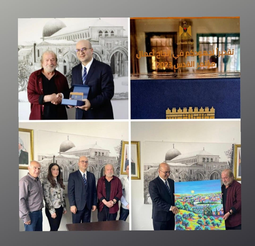 القدس - أخبار البلد - في مكتب وزير القدس وبحضور طاقم الوزارة تم تكريم الفنانين التشكيليين الذين شاركوا بأعمالهم بمعرض أقيم على هامش القمة العربية في القاهرة دعما للقدس ، حيث قام الوزير فادي الهدمي بتقديم درع للفنان سليمان منصور والفنان طالب الدويك والفنان شهاب القواسمي والفنانة نادين طوقان تقدير لجهودهم الفنية وشكرا لمشاركتهم