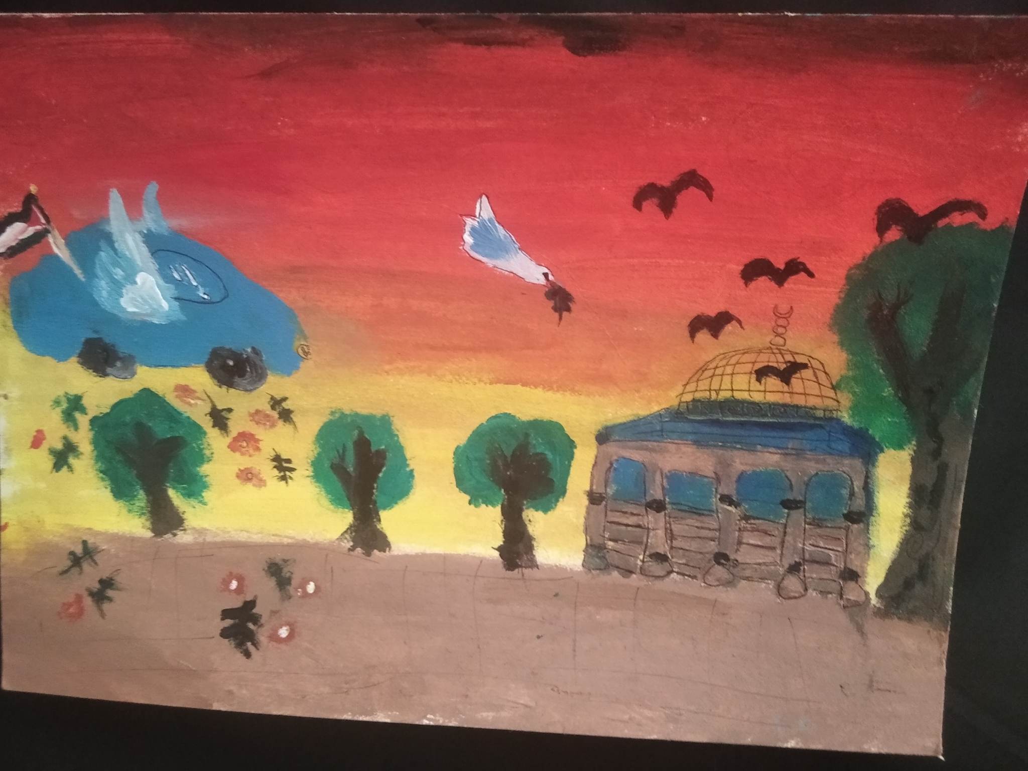 لوحات أطفال فلسطين تتقدم اليوم لتصوير حياتهم وأحلامهم، فمن خلال الحلم والألوان ينتصر طفل فلسطيني جميل على سلاح الاحتلال الذي له طريق واحد: الانتهاء.