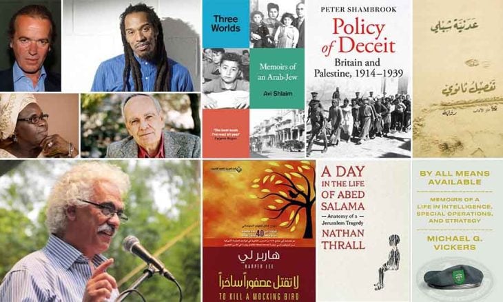 ومن الكتب الصادرة عن فلسطين والشرق الأوسط «يوم في حياة عابد سلامة» لمؤلفه ناثان ثرول. وهو كتاب يستعيد حادث تحطم حافلة كانت تقل أطفال مدرسة فلسطينيين اصطدمت مع شاحنة في 2012 قرب القدس. وعابد سلامة هو والد أحد الأطفال الذين ماتوا. وقد طور ثرول الكتاب من مقالة نشرها قبل عامين في مجلة «نيويورك لمراجعة الكتب» وهو في النهاية استكشاف لتاريخ النزاع الفلسطيني- الإسرائيلي. وهو يستعرض حياة الفلسطينيين الذين يعيشون في ظل الاحتلال الإسرائيلي، ويقدم تفاصيل معروفة لكل أب وهي البحث عن ابنه بعد الحادث ومحاولة معرفة مصيره في المستشفى. ومع أن حوادث الطرق تحصل في كل مكان إلا أن ثرول أراد التأكيد على الرعب من حادث الحافلة نابع من أن حيوات الفلسطينيين تتشكل من خلال تحكم إسرائيل بها. وأيضا صدر كتاب للمؤرخ بيتر شامبروك بعنوان «سياسة الخداع، بريطانيا وفلسطين 1914- 1919» كشف فيه عن الخديعة البريطانية منذ البداية وكذبها بشأن ما تريد عمله في فلسطين. وفي مركز تحقيقه وتحليله الصفقة التي عقدها البريطانيون مع حسين بن علي، شريف مكة مع بداية الحرب العالمية الأولى، وكانت الصفقة سهلة، فمقابل إعلان الشريف حسين الثورة ضد العثمانيين، وعدت بريطانيا بمنحه دولة عربية بعد نهاية الدولة العثمانية. وكشف شامبروك في تحليله للوثائق الخاصة بأن بريطانيا وعدت الشريف حسين فلسطين، خلافا لما حاول مؤرخون سابقون تجاهله. وقال إن صناع السياسة، كذبوا منذ البداية، ومنهم ديفيد لويد جورج وأرثر بلفور وجورج كيرزون ووينستون تشرتشل. وفي قلب الخديعة كلمة «مناطق» التي هي الترجمة لكلمة ولايات التي وردت في رسائل حسين- مكماهون. وكان المؤرخ أرنولد توينبي والذي كان مسؤولا بوزارة الخارجية خلال الحرب العالمية الأولى قد كتب «لم تكن فلسطين مستثناة من المناطق التي وعدت الحكومة البريطانية بها في 1915 والاعتراف بالاستقلال العربي ودعمه، وكان وعد بلفور غير متناسق مع الإلتزام السابق». وقال توينبي إن الخداع هو أسوأ جريمة يقوم بها الدبلوماسي المحترف لأنها تشوه سمعة البلد والتعامل الصادق». ومن الكتب الصادرة والمهمة في فهم سياق الأحداث في غزة، كتاب انطوني لويستين «المختبر الفلسطيني: كيف تصدر إسرائيل تكنولوجيا الاحتلال حول العالم» الذي استعرض فيه كيفية استخدام وتجريب إسرائيل أسلحتها على الفلسطينيين في الضفة الغربية وغزة، في الترويج لصفقات أسلحتها مع الدول وفي معارض الأسلحة. إلى جانب تحليل علاقة إسرائيل مع الأنظمة الديكتاتورية من نظام أوغستو بينوشيه ونظام الفصل العنصري البائد في جنوب أفريقيا. وأصدر الأكاديمي الإسرائيلي المقيم في بريطانيا آفي شليم «مذكرات يهودي عربي» عن حياة عائلته في العراق والشكوك من الحركة الصهيونية، ثم حملة التفجيرات التي خوفت اليهود للرحيل إلى إسرائيل.
