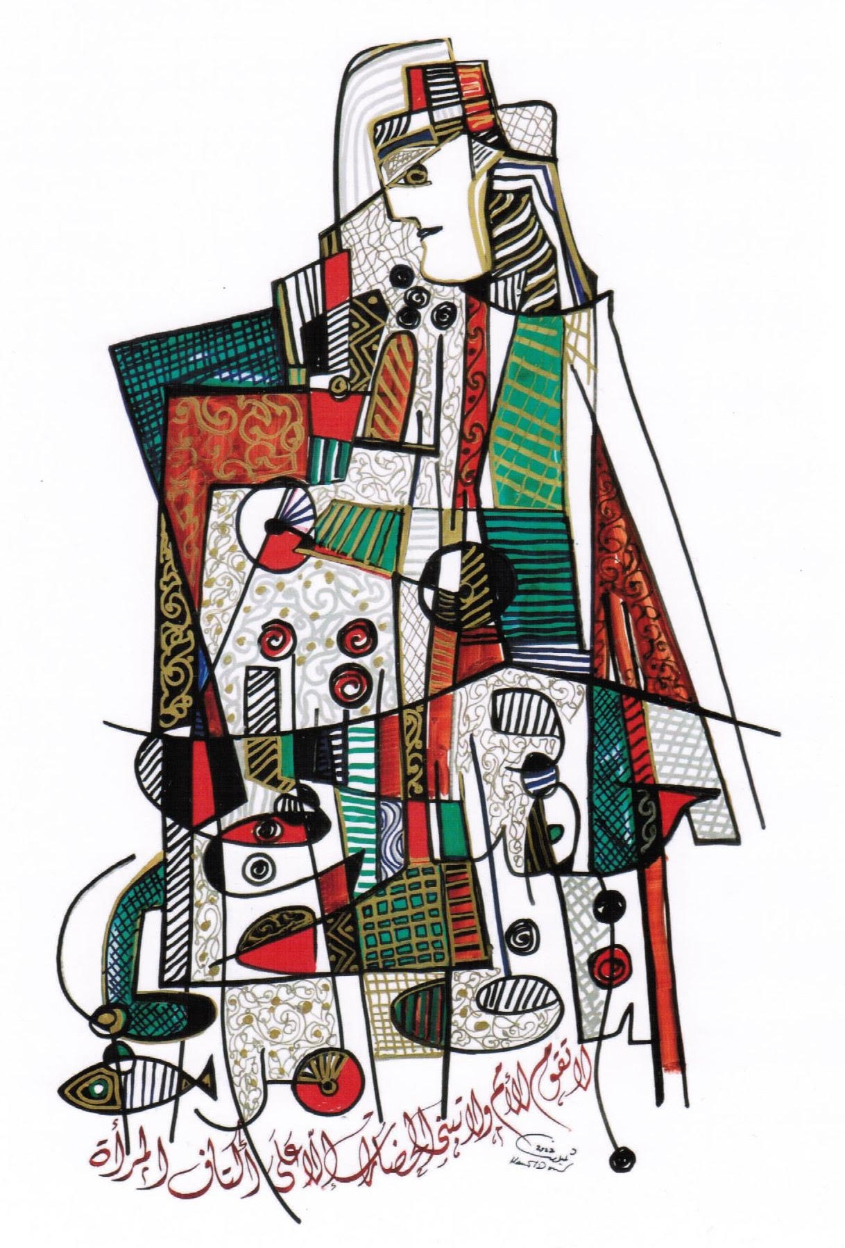 لعلّ التنوع اللوني في كل حرف من الحروف قد جاء تعبيرًا مجازيًا عن هذا الحضور النصي اللغوي ذي البعد الاجتماعي والسياسي والفني والشعري؛ بحيث تكون المرأة هي الصورة الحاضرة من خلال الحروف، ويكون المعنى الشمولي للمرأة هو كل ما يتعلق بالأشياء والأحرف ذات الدلالة الاجتماعية والسياسية لوضع المرأة في هذا النص الشعري. وقد استطاع كميل أن يعبّر عن هذا الوضع تعبيرًا واضحًا من خلال تضافر الحروف المرسومة والملونة لإظهار قيمة النص اجتماعيًا وسياسيًا ورمزيًا وفنيًا.