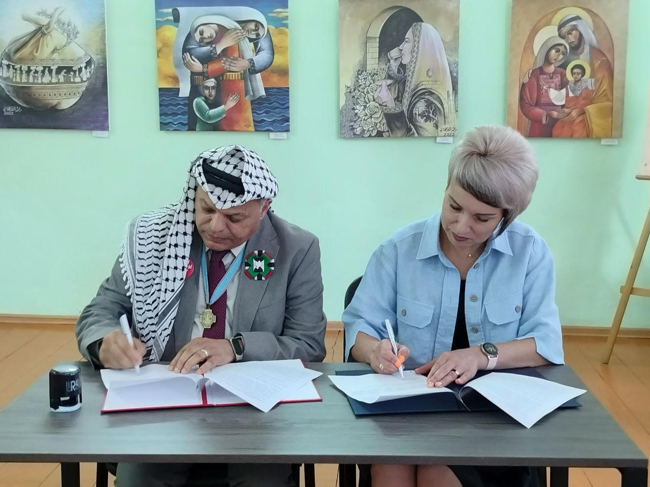وشهد الحفل توقيع اتفاقية بين بلدية مدينة سيردوبسكي والمنظمة العامة الإقليمية لجمهورية تشوفاشيا "جمعية الصداقة والتعاون بين شعوب تشوفاشيا وفلسطين" والذي مثلها الدكتور بسام فتحي البلعاوي الذي شكر طاقم المدرسة ومنظمي الفعالية وقام بجولة تفصيلية وشرح كامل عن جميع لوحات المعرض وعن الفنانين المشاركين فيه لجميع الحاضرين.