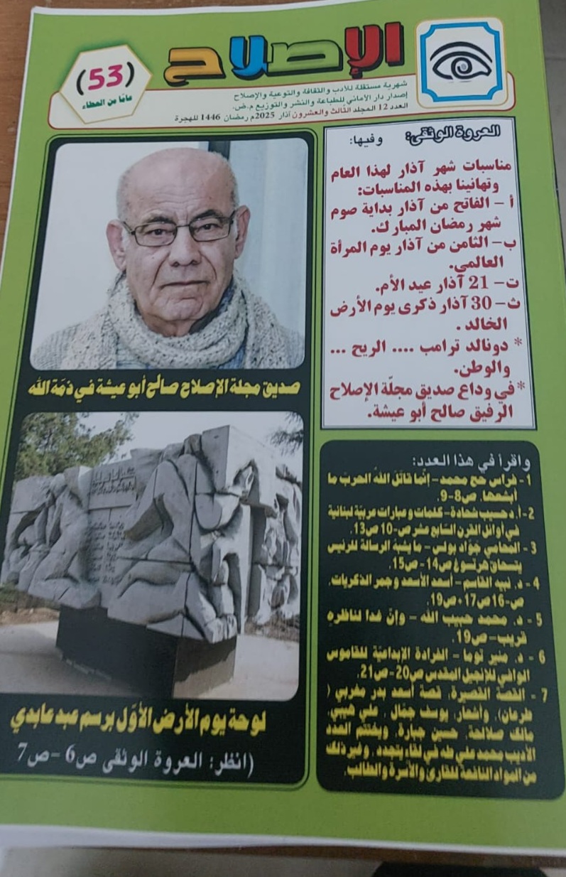 القدس - أخبار البلد - صدر في شهر رمضان سنة 1446ه، الموافقة لأوائل شهر آذار سنة 2025م، العدد الثّاني عشر من مجلّة "الإصلاح"، عن دار "الأماني" للطّباعة والنّشر والتّوزيع في "عرعرة- فلسطين"، وهذا العدد يختتم المجلّد الثّالث والعشرين.