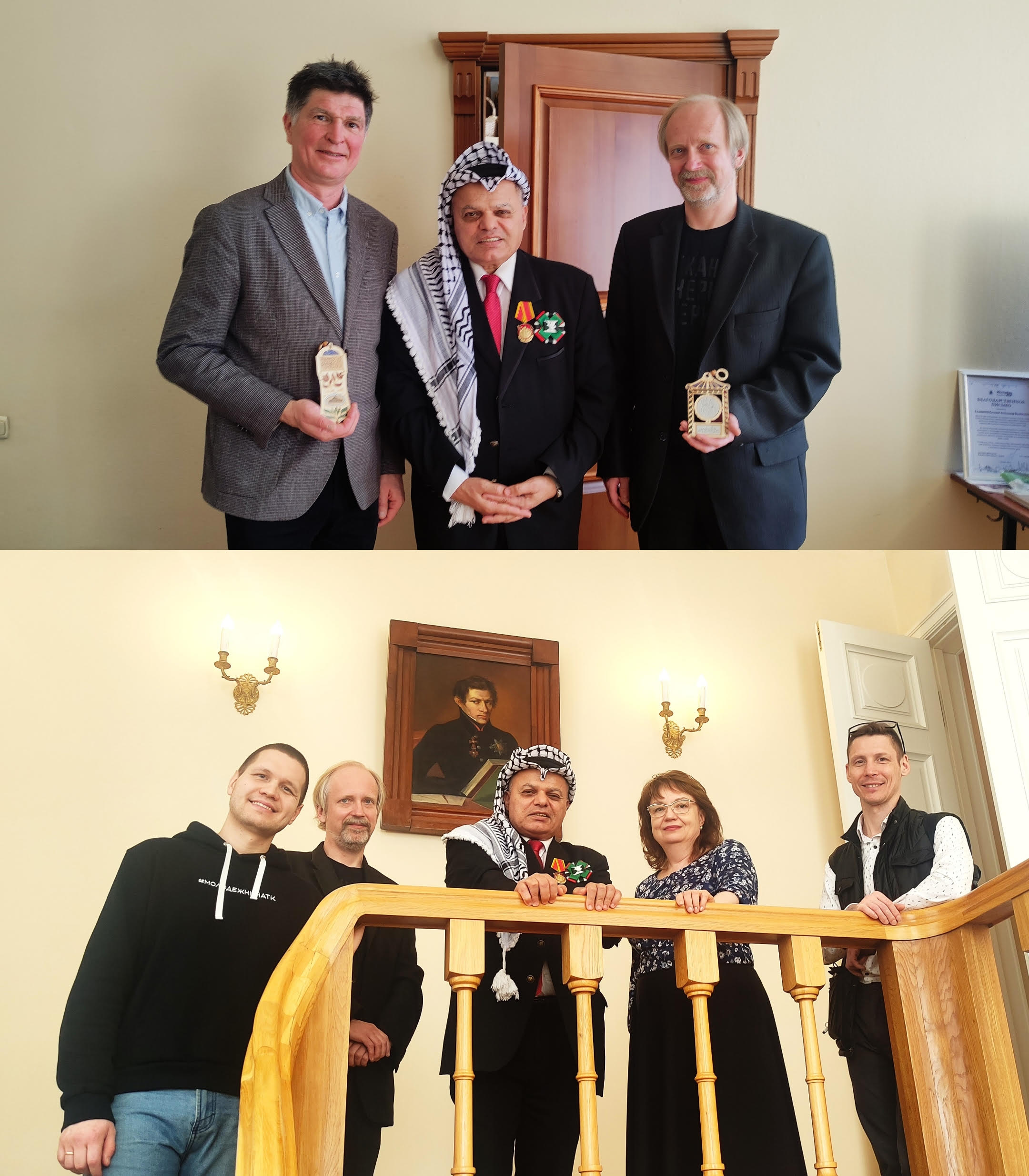 ومن ثم اصطحب مدير معهد الفيزياء، بالجامعة البروفيسور، "مارات جافورف"، ضيوفه الى المبنى التاريخي الرئيسي للجامعة، حيث كانت بانتظارهم البروفيسورة في التاريخ، السيدة "سفيتلانا فرولوفا، رئيسة متاحف الجامعة وعددها 12 متحفا، ودار بينهم حديثا مفيدا تطرق لتاريخ العلاقات التي ربطت وما تزال تربط تربط شعوب روسيا وفلسطين، وتطرق الحديث لكافة الظروف التي يعيشها الشعب الفلسطيني حاليا، ولكيفية التعاون بين الجمعية الامبراطورية الارثوذكسية الفلسطينية والجامعة، في تنظيم المعارض الفنية التثقيفية للطلاب الدارسين بالجامعة.