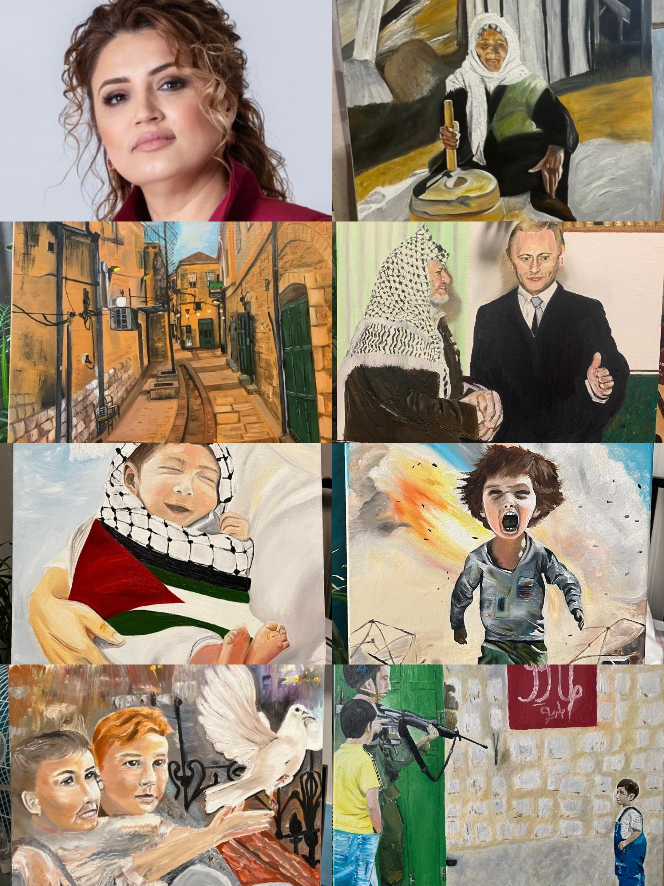 تظهر الفنانة أهوال الحرب من خلال عيون طفل، لا شعارات هنا فقط صرخات ألم ، يجسّد هذا الصبي آلاف الأطفال الذين دمرت الحرب طفولتهم. ومضاتٌ ساطعة من الأحمر والأصفر، تتباين مع السماء، تُولّد توترًا عاطفيًا يصعب تجاهله. "أطفال فلسطين" لوحةٌ تُعبّر عن هشاشة الحياة وحق كل طفل في اللعب ببساطة تحت سماءٍ هادئة.