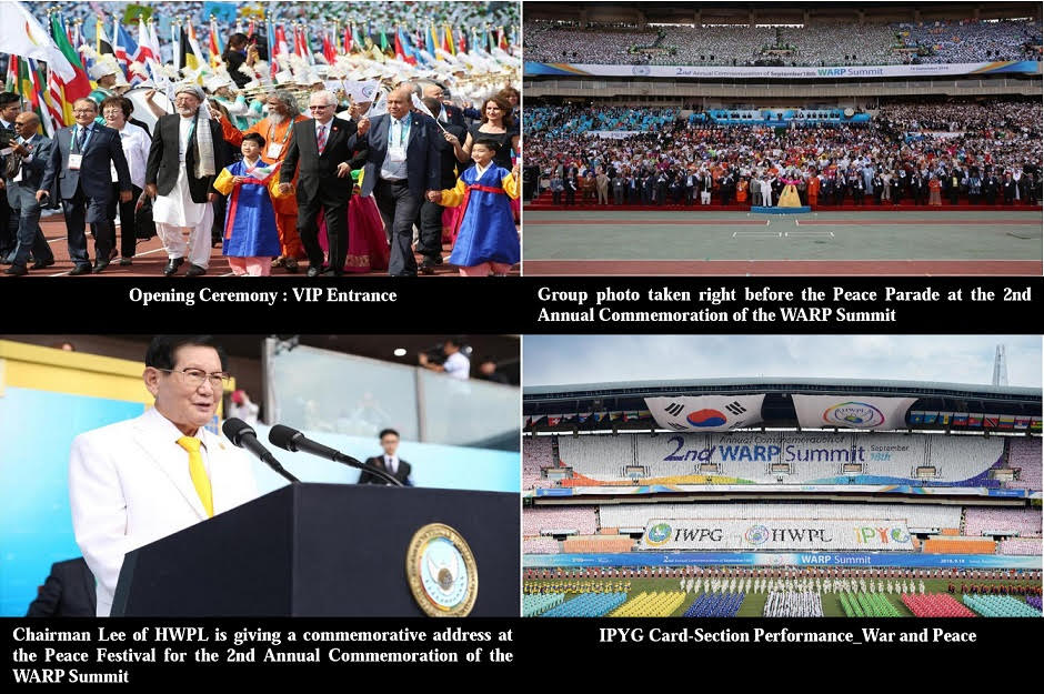 سيول - اخبار البلد- شهد ستاد جاسميل الأولمبي بمدينة سيول ، افتتاح القمة الثانية لـ " التحالف العالمي للأديان من أجل السلام " ( WARP ) ، و هي القمة التي تنظمها مؤسسة " الثقافة السماوية و السلام العالمي- استعادة النور " ( ( HWPL و رئيسها مان هي لي ،و " الجماعة النسائية العالمية للسلم ( IWPG ) و رئيستها نام هي كيم ، و " الجماعة الشبابية الدولية للسلام " ( IPYG )و مديرها ديو هيان كيم .