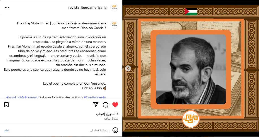 مساء السابع من حزيران عام 2025 تأتيني المفاجأة، ترجمة قصيدة "متى سيتجلى الله يا جبريل؟" إلى اللغة الإسبانية مع تعريف بي بفقرتين قصيرتين بعناية ومتابعة وترجمة الشاعرة الفلسطينية فاطمة نزال، ونشرت في الموقع الإلكتروني https://con-versandorevistaiberoamericana.mx/ المجلة الأيبيرية للشعر والمقالات، هكذا اقترح الترجمة موقع جوجل، وتختص بالأدب الإسباني أو الترجمة إلى الإسبانية.